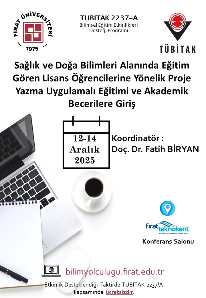 TÜBİTAK 2237-A Bilimsel Eğitim Etkinliklerini Destekleme Programı kapsamında düzenlenecek olan "Sağlık ve Doğa Bilimleri Alanında Eğitim Gören Lisans Öğrencilerine Yönelik Proje Yazma Uygulamalı Eğitimi ve Akademik Becerilere Giriş" eğitimine katılmak isteyen katılımcıların bilimyolculugu.firat.edu.tr web sayfasında yer alan bilgileri dikkatlice okuyup, başvuru formunu doldurarak ön kayıtta bulunmaları gerekmektedir. Başvuru formu içinTıklayınız. Başvuru formu 7 Aralık 2025 tarihine kadar gönderilmelidir. Kurs ücretsiz olup, yol, yemek ve ulaşım masrafları TUBİTAK 2237-A programı kapsamınca karşılanacaktır.